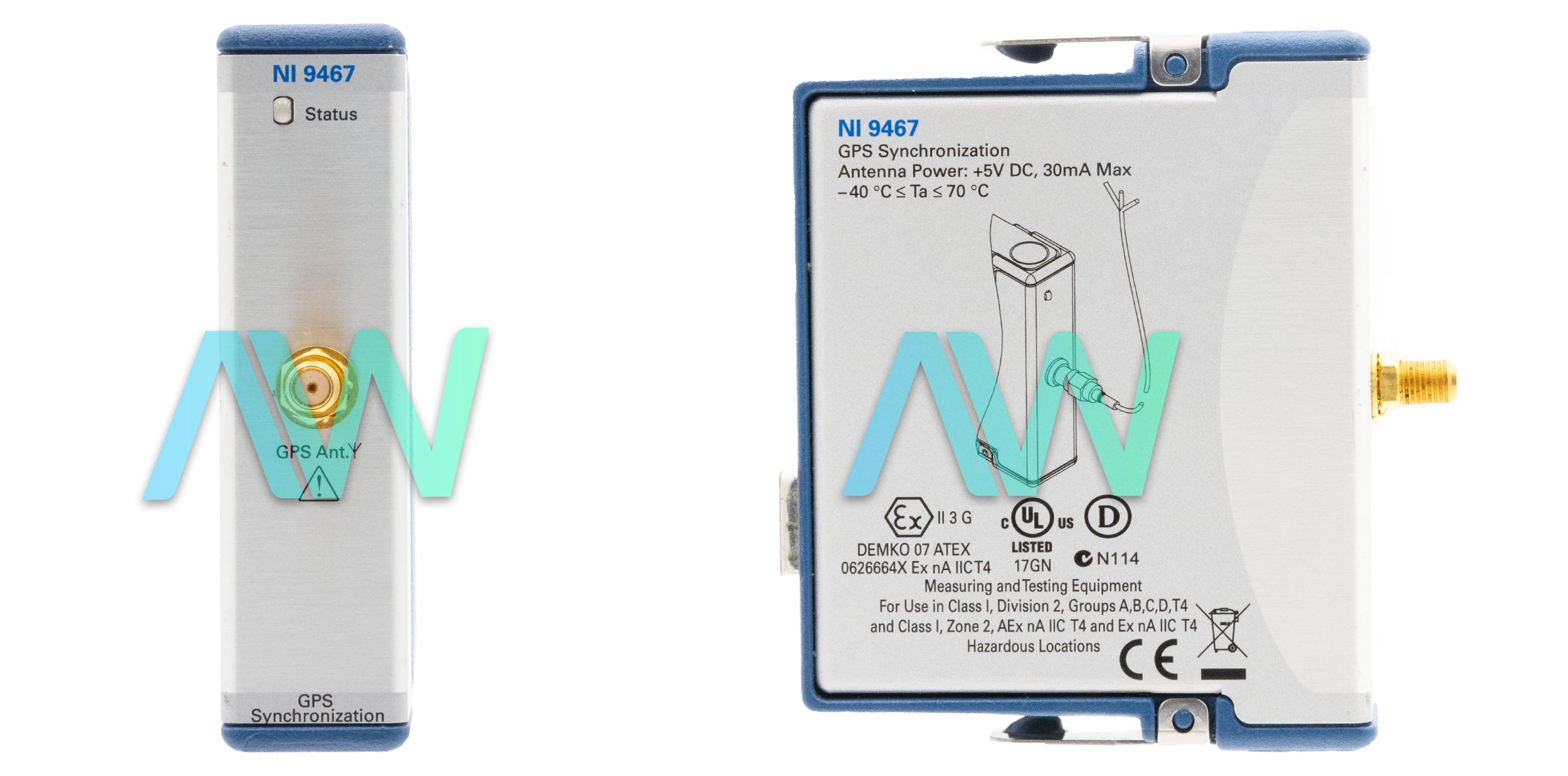 The NI 9467 GPS Module (Part numbers: 781632-01, 151799E-01L) delivers precise time synchronization to NI CompactRIO systems. Users can employ the NI-9467 for these applications: power quality assessment systems, wind farm monitoring systems, bridge and large building structural health monitoring systems, and electrical grid phasor measurement units (PMUs). The NI-9467 has +5 VDC or 30 mA maximum for the active GPS antenna, a SMA female antenna connector type, CompactRIO support, and does not work for mobile applications.