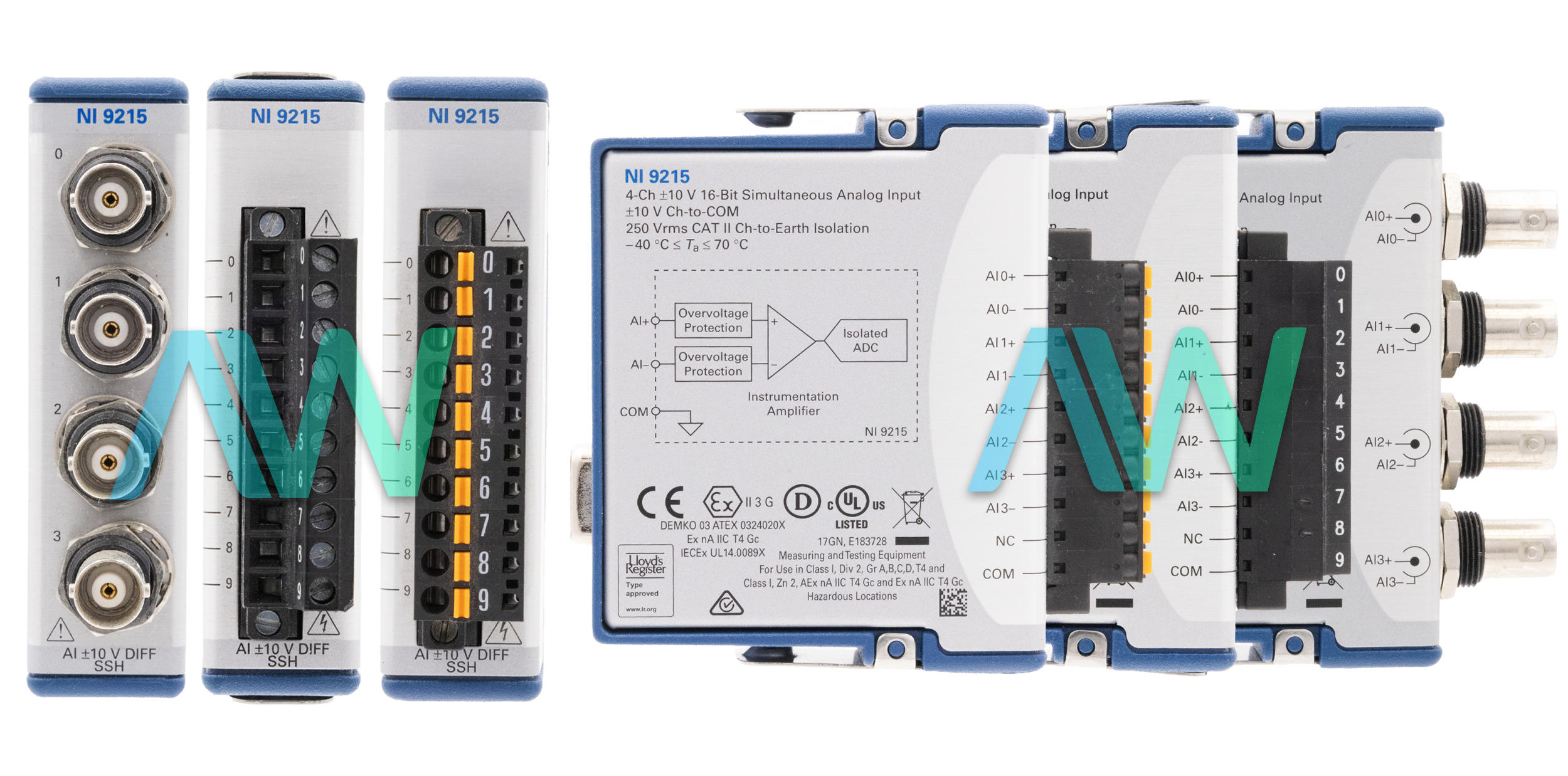 The NI-9215 comes with overvoltage protection of ±30 V. It allows for errant signal connection or unanticipated outputs to the individual channels. The device is equipped with a BNC, spring terminal, or screw terminal front connector.The BNC-equipped model of the device weighs 6.1 ounces, its screw terminal-equipped counterpart weighs 5.3 ounces, and the spring terminal-equipped model has a weight of 4.9 ounces. It is recommended to operate this NI device within a temperature range spanning from -40 °C to 70 °C.