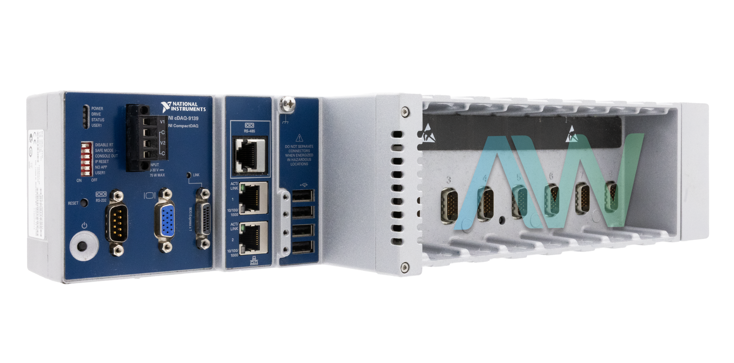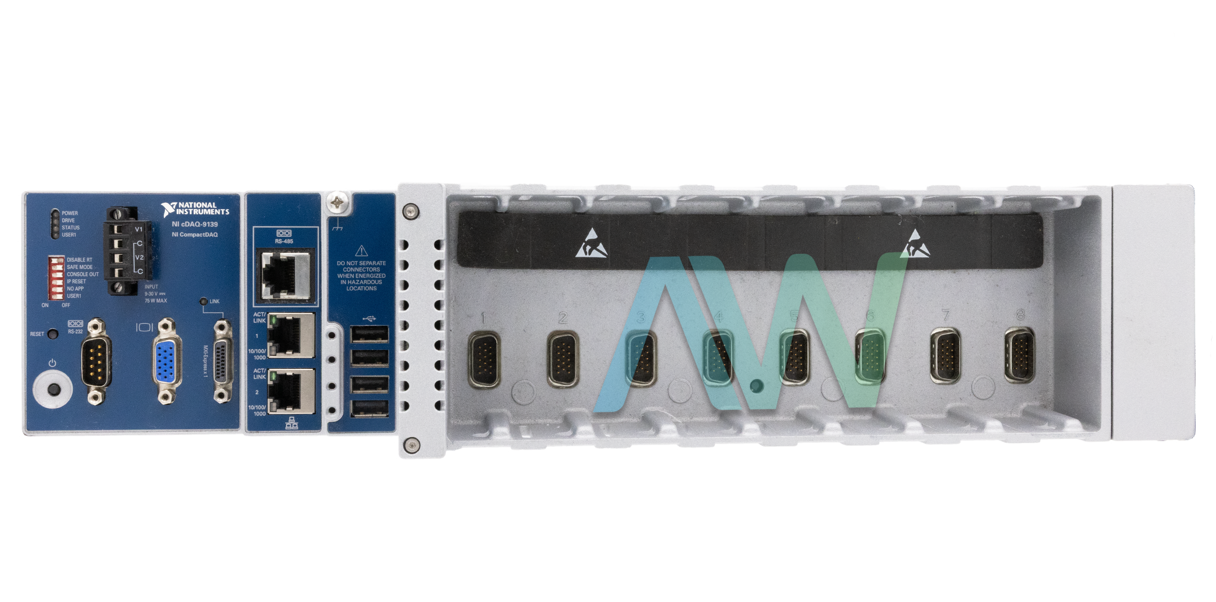 The NI cDAQ-9139 can be combined with up to eight I/O modules. This CompactDAQ Controller offers a wide array of communication interfaces, including: 2 Ethernet Ports, 1 RS-232 Serial Port, 1 RS-485/422 Serial Port, 1 MXI-Express Port, 4 USB 2.0 Hi-Speed Ports, and 1 Video (VGA) Port.