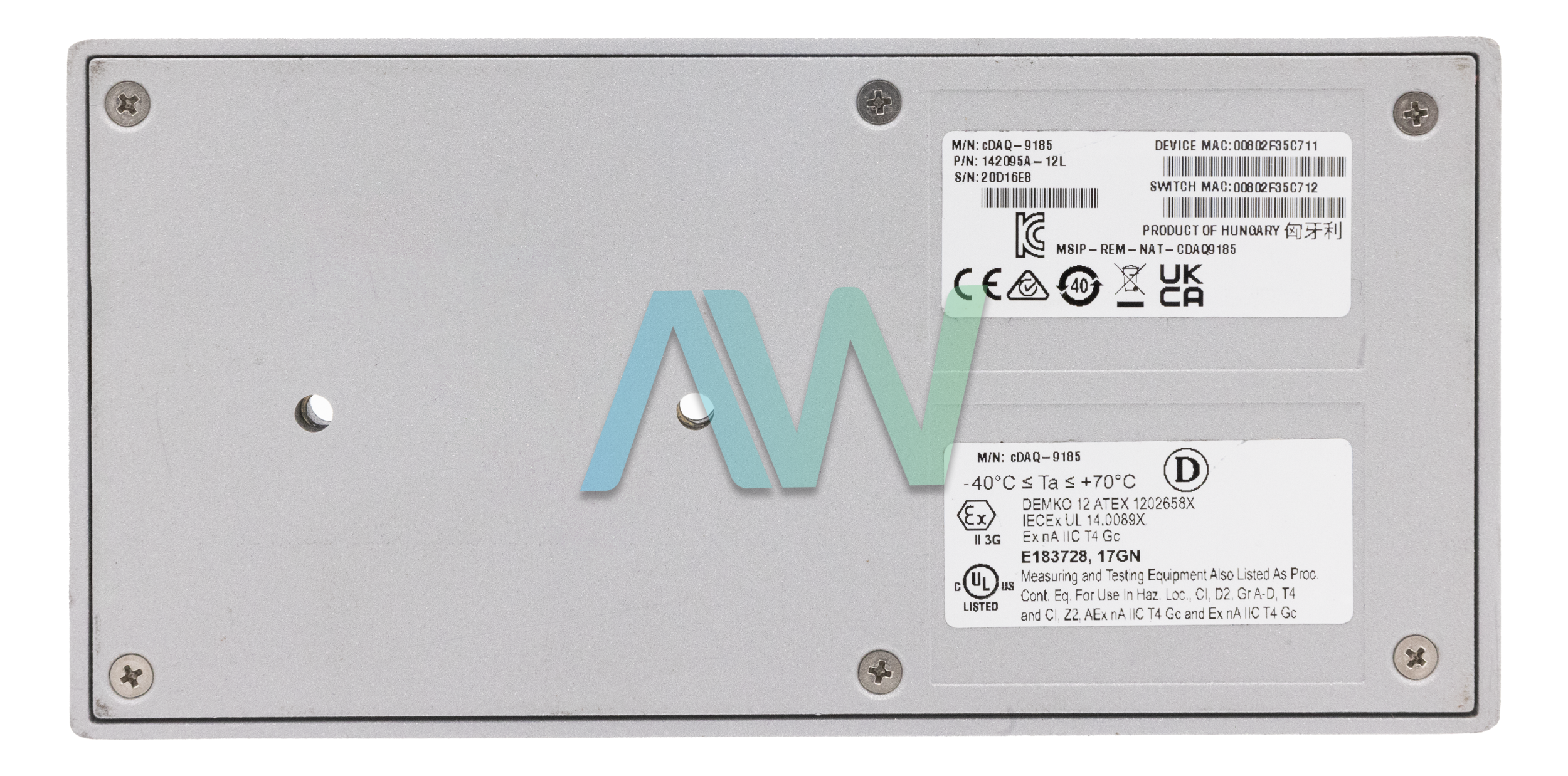 The NI device weighs 23.3 oz and measures 7.01 x 3.47 x 2.52 in. in physical dimensions. It has a recommended operating temperature range of -40 °C to 70 °C; a storage temperature range of -40 °C to 85 °C; non-condensing operating and storage humidity ranges of 10% to 90% RH and 5% to 95% RH, respectively; and random and sinusoidal operating vibrations of 5 grms and 5 g, respectively—all at a frequency range of 10 to 500 Hz. More information about the cDAQ-9185 can be found in the datasheets and manuals of the "Manuals & PDFs" tab.