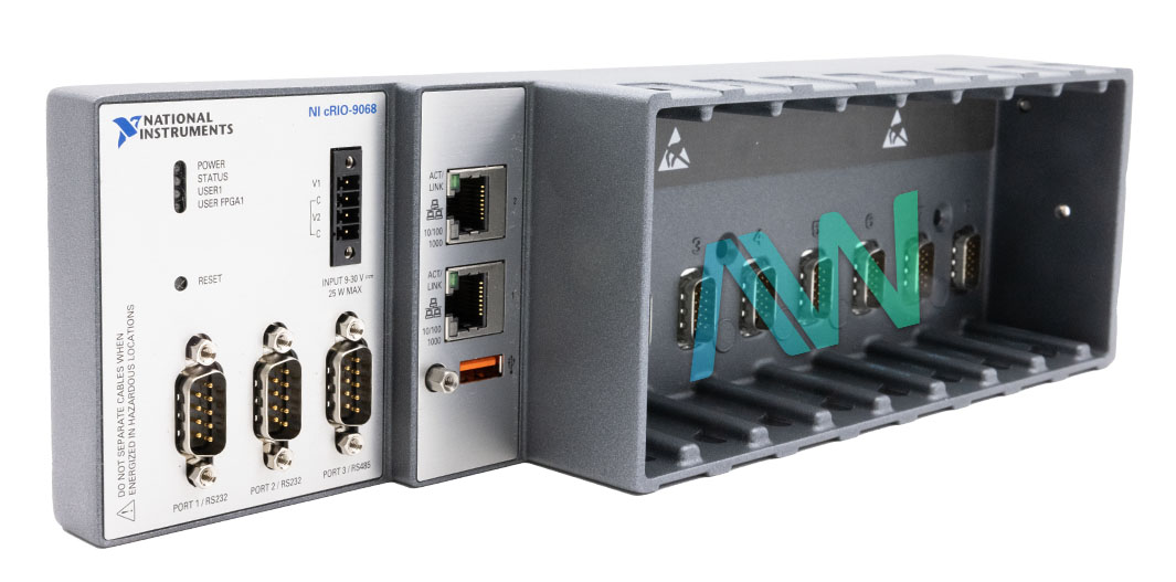 This model comes with two RS-232 serial ports, one RS-485 serial port, and two Ethernet ports, as well as a Universal Serial Bus (USB) host port. Unlike its predecessor, the power connector of the cRIO-9068 has terminals for two power inputs, which allows the user to utilize redundant power supplies in a primary and secondary configuration. In its standard configuration, the NI cRIO-9068 operates from the primary power source (V1 input) and switches over to the secondary power source (V2) automatically when needed. The device has a 10/100/1,000 Ethernet network interface, which is compatible with IEEE 802.3, and has communication rates of 10 Mbps, 100 Mbps, and 1,000 Mbps auto-negotiated.