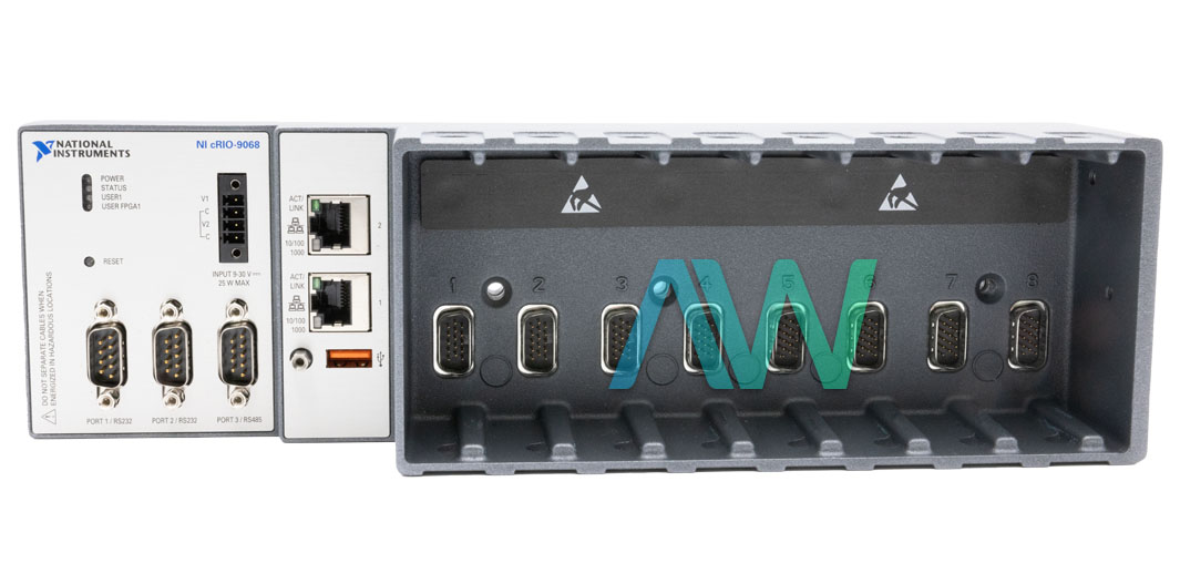 The National Instruments cRIO-9068 (Part Numbers: 782663-01 and 782663-02) is an embedded RT controller designed for C Series modules. This controller comes with a dual-core 667 MHz ARM Cortex-A9 processor, 512 MB DRAM, reconfigurable Zynq-7020 FPGA, 1 GB internal storage, and 8 slots. The NI cRIO-9068 is a combination of an embedded chassis and a real-time controller for CompactRIO.